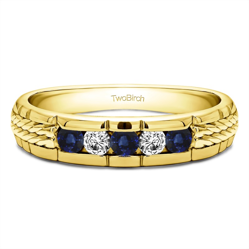This men's ring features 3, blue and white round channel set stones. The band measures 5.5mm in total width. The total combined carat weight is 0.36 carats. This listing features natural blue sapphires and natural diamonds. This men's ring weighs 14.67 grams and features a comfort fit band. This ring has a braided center with high polished edges.