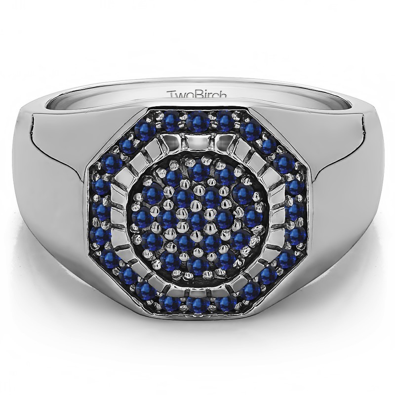 This men's ring features 43, blue round channel set stones. The band measures 5.5mm in total width. The total combined carat weight is 0.48 carats. This listing features natural blue sapphires. This men's ring weighs 17.67 grams and features a comfort fit band. This men's ring has an engraved with a cluster of prong set stones in the center.