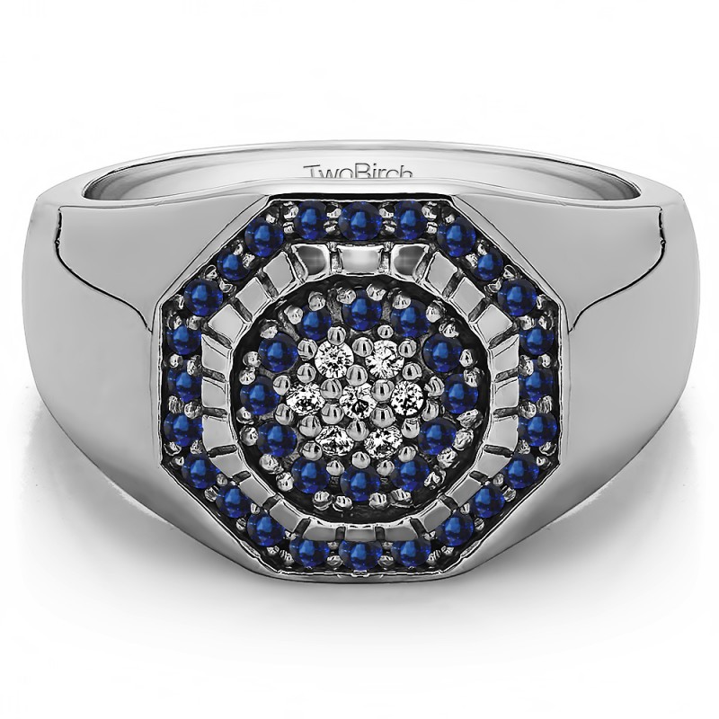 This men's ring features 43, blue and white round channel set stones. The band measures 5.5mm in total width. The total combined carat weight is 0.48 carats. This listing features natural blue sapphires and natural diamonds. This men's ring weighs 17.67 grams and features a comfort fit band. This men's ring has an engraved with a cluster of prong set stones in the center.