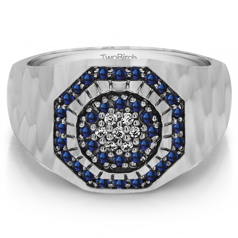 This men's ring features 43, blue and white round channel set stones. The band measures 5.5mm in total width. The total combined carat weight is 0.48 carats. This listing features natural blue sapphires and natural diamonds. This men's ring weighs 17.16 grams and features a comfort fit band. This men's ring has an engraved design with a cluster of prong set stones in the center. It features a stunning hammered finish.