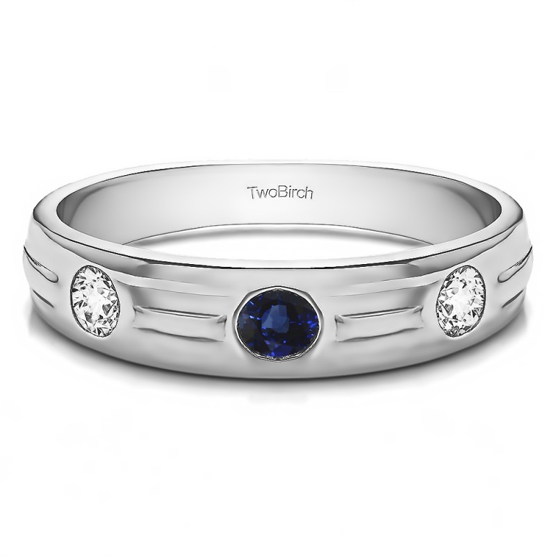 This men's ring features 3, blue and white round channel set stones. The band measures 5.5mm in total width. The total combined carat weight is 0.48 carats. This listing features natural blue sapphires and natural diamonds. This men's ring weighs 12.81 grams and features a comfort fit band. This men's band features a raised center between the stones with a polished finish.