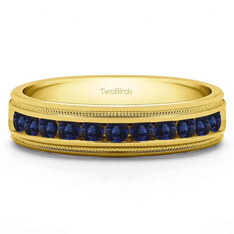 This men's ring features 11, blue round channel set stones. The band measures 5.5mm in total width. The total combined carat weight is 0.5 carats. This listing features natural blue sapphires. This men's ring weighs 7.51 grams and features a comfort fit band. This men's ring features a traditional channel with millgrained edges.