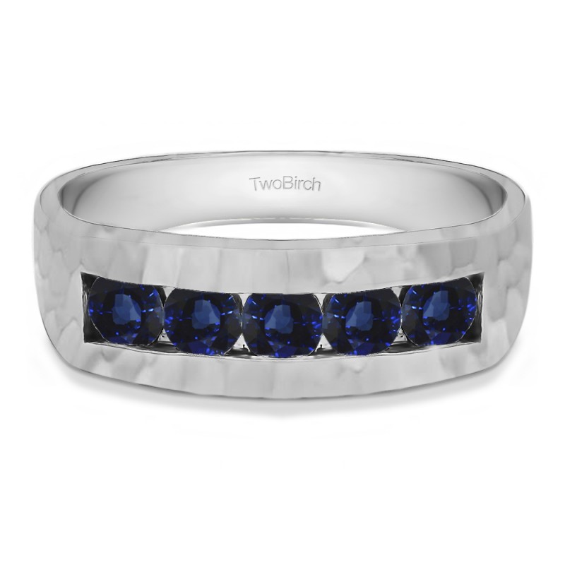This men's ring features 5, blue round channel set stones. The band measures 5.5mm in total width. The total combined carat weight is 0.5 carats. This listing features natural blue sapphires. This men's ring weighs 13.01 grams and features a comfort fit band. This men's ring features a flat top and a hammered finish.