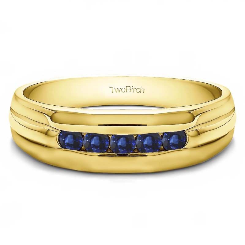 This men's ring features 5, blue round channel set stones. The band measures 5.5mm in total width. The total combined carat weight is 0.5 carats. This listing features natural blue sapphires. This men's ring weighs 14.67 grams and features a comfort fit band. This ring has a raised center with flat high polished edges.