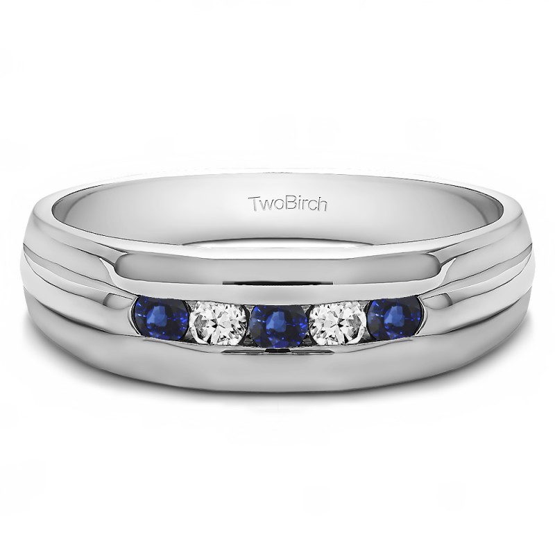 This men's ring features 5, blue and white round channel set stones. The band measures 5.5mm in total width. The total combined carat weight is 0.5 carats. This listing features natural blue sapphires and natural diamonds. This men's ring weighs 14.67 grams and features a comfort fit band. This ring has a raised center with flat high polished edges.