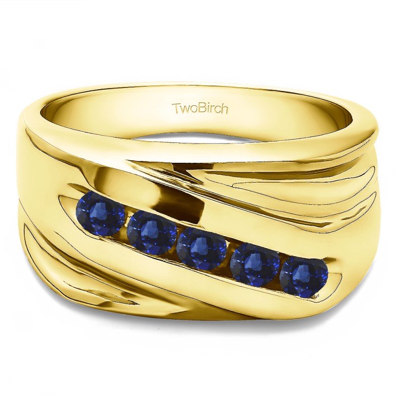 This men's ring features 5, blue round channel set stones. The band measures 5.5mm in total width. The total combined carat weight is 0.5 carats. This listing features natural blue sapphires. This men's ring weighs 18.28 grams and features a comfort fit band. This men's wedding ring has a straight channel, with a ribbed shank design and a high polish finish.