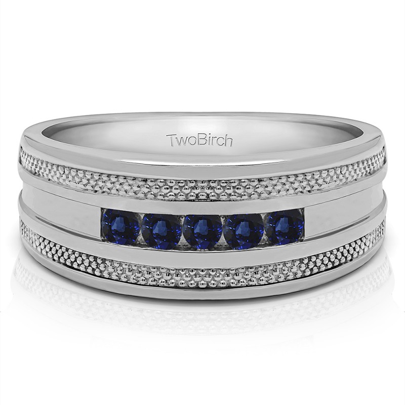 This men's ring features 5, blue round channel set stones. The band measures 5.5mm in total width. The total combined carat weight is 0.5 carats. This listing features natural blue sapphires. This men's ring weighs 17.46 grams and features a comfort fit band. This men's ring is wide, with millgraining on both sides of the shank, and a polished center.