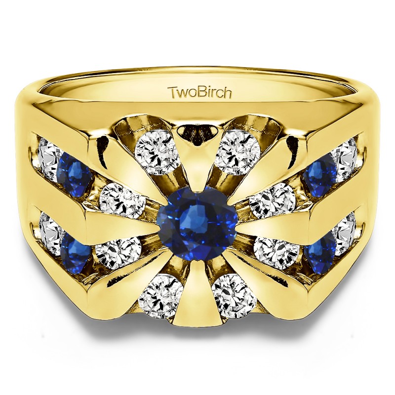 This men's ring features 17, blue and white round channel set stones. The band measures 5.5mm in total width. The total combined carat weight is 0.5 carats. This listing features natural blue sapphires and natural diamonds. This men's ring weighs 17.78 grams and features a comfort fit band. This men's ring is wide and has a raised center. It is often referred to as a jawbreaker ring.