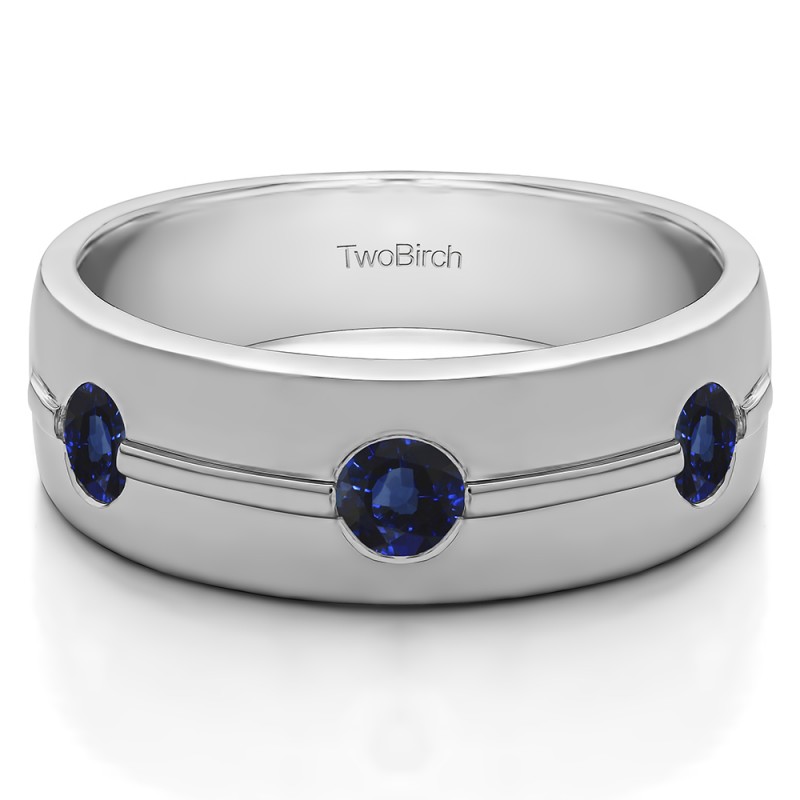 This men's ring features 3, blue round burnished set stones. The band measures 5.5mm in total width. The total combined carat weight is 0.5 carats. This listing features natural blue sapphires. This men's ring weighs 14.68 grams and features a comfort fit band. This men's ring has a low cut out line in the center between the stones and features a polished finish.