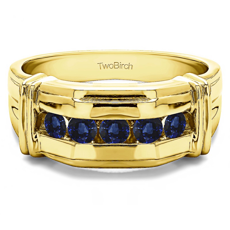 This men's ring features 5, blue round channel set stones. The band measures 5.5mm in total width. The total combined carat weight is 0.5 carats. This listing features natural blue sapphires. This men's ring weighs 12.08 grams and features a comfort fit band. This men's band features a raised design on each of the channel with a flat top center.
