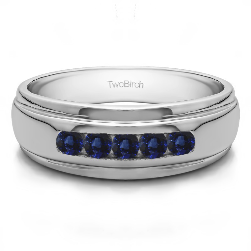 This men's ring features 5, blue round channel set stones. The band measures 5.5mm in total width. The total combined carat weight is 0.5 carats. This listing features natural blue sapphires. This men's ring weighs 13.68 grams and features a comfort fit band. This men's ring features a cluster design with a flat top made up of prong set stones.