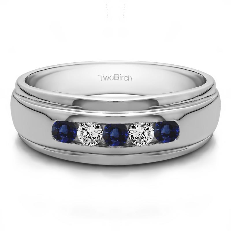 This men's ring features 5, blue and white round channel set stones. The band measures 5.5mm in total width. The total combined carat weight is 0.5 carats. This listing features natural blue sapphires and natural diamonds. This men's ring weighs 13.68 grams and features a comfort fit band. This men's ring features a cluster design with a flat top made up of prong set stones.