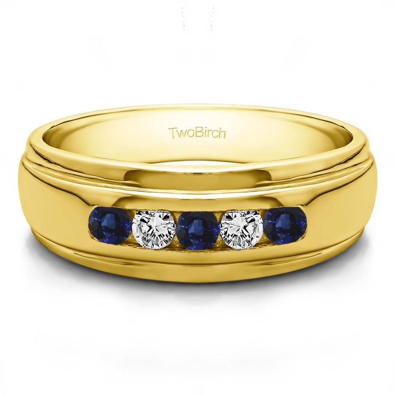 This men's ring features 5, blue and white round channel set stones. The band measures 5.5mm in total width. The total combined carat weight is 0.5 carats. This listing features natural blue sapphires and natural diamonds. This men's ring weighs 13.68 grams and features a comfort fit band. This men's ring features a cluster design with a flat top made up of prong set stones.