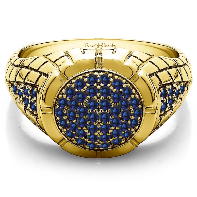 This men's ring features 54, blue round prong set stones. The band measures 5.5mm in total width. The total combined carat weight is 0.54 carats. This listing features natural blue sapphires. This men's ring weighs 8.47 grams and features a comfort fit band. This men's ring has a domed shape with a flat top. The top of the ring has prong set round stones with ribbed details on the shank.