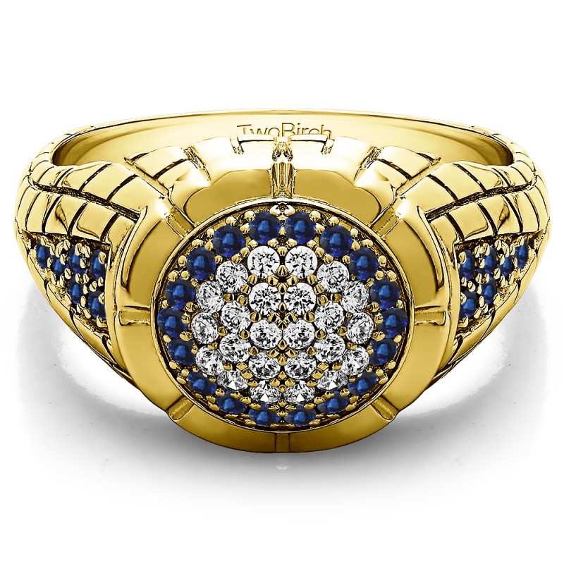 This men's ring features 54, blue and white round prong set stones. The band measures 5.5mm in total width. The total combined carat weight is 0.54 carats. This listing features natural blue sapphires and natural diamonds. This men's ring weighs 8.47 grams and features a comfort fit band. This men's ring has a domed shape with a flat top. The top of the ring has prong set round stones with ribbed details on the shank.