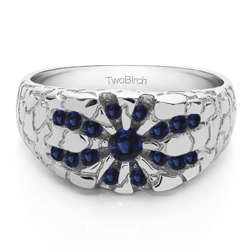 This men's ring features 17, blue round channel set stones. The band measures 7 in total width. The total combined carat weight is 0.71 carats. This listing features natural blue sapphires. This men's ring weighs 11.01 grams and features a comfort fit band. This men's ring features an engraved design with a high polish finish. It also has a cut out gallery making it lighter but still sturdy.