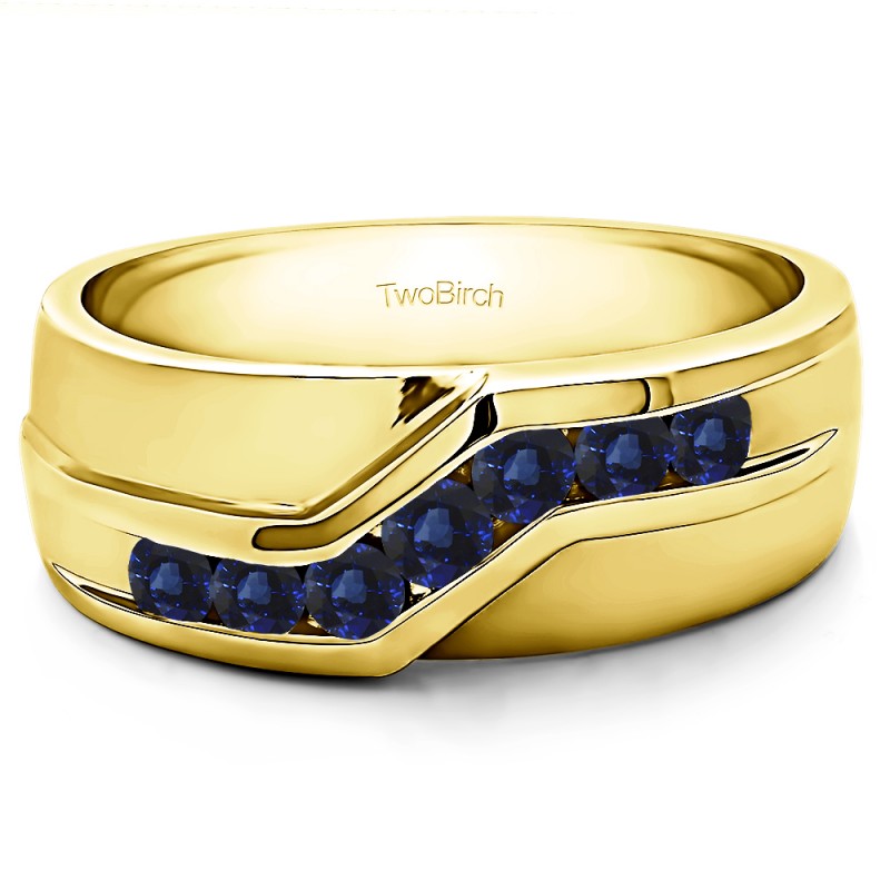 This men's ring features 7, blue round channel set stones. The band measures 5.5mm in total width. The total combined carat weight is 0.75 carats. This listing features natural blue sapphires. This men's ring weighs 15.72 grams and features a comfort fit band. This men's ring has a lightning bolt shaped, raised channel, with a high polish finish.