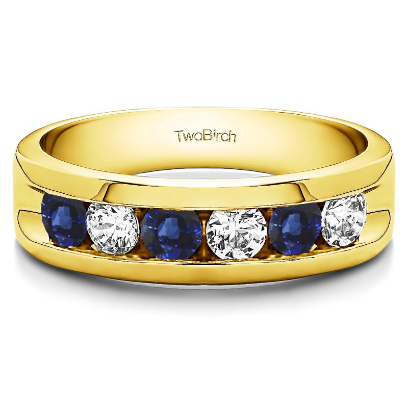 This men's ring features 6, blue and white round channel set stones. The band measures 5.5mm in total width. The total combined carat weight is 0.99 carats. This listing features natural blue sapphires and natural diamonds. This men's ring weighs 11.35 grams and features a comfort fit band. This men's ring has a wide channel, with open ends, and high polish finish.
