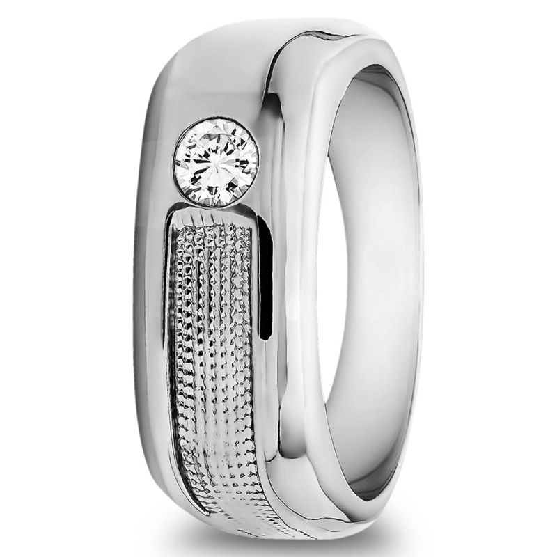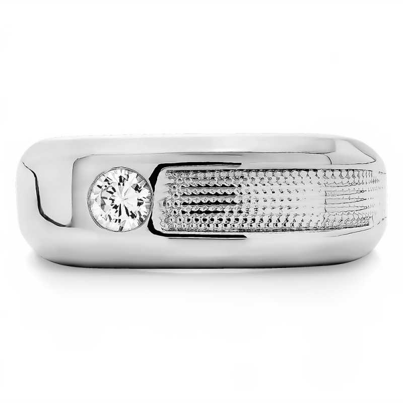 This men's ring features 1 white round burnished set stones. The band measures 5.5mm in total width. The total combined carat weight is 0.24 carats. This listing features moissanite, cubic zirconia or natural diamonds. This men's ring weighs 21.46 grams and features a comfort fit band. This men's ring has a flat top with a ribbed shank, and high polish finish.
