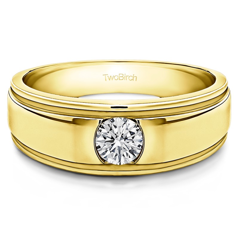 This men's ring features 1 white round burnished set stones. The band measures 5.5mm in total width. The total combined carat weight is 0.25 carats. This listing features moissanite, cubic zirconia or natural diamonds. This men's ring weighs 10.36 grams and features a comfort fit band. This men's solitaire ring features a ribbed edge on the shank and a high polish finish.