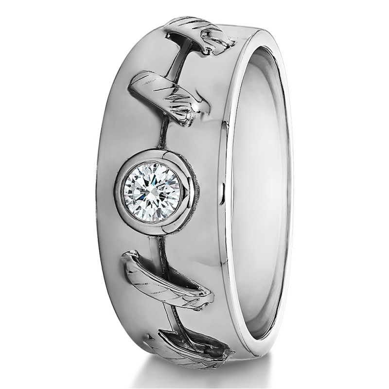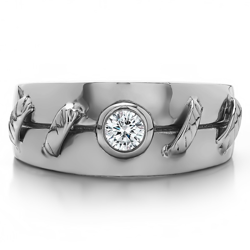 This men's ring features 1 white round channel set stones. The band measures 5.5mm in total width. The total combined carat weight is 0.3 carats. This listing features moissanite, cubic zirconia or natural diamonds. This men's ring weighs 16.64 grams and features a comfort fit band. This men's ring is unique with four raised sections with ribbed detailing.