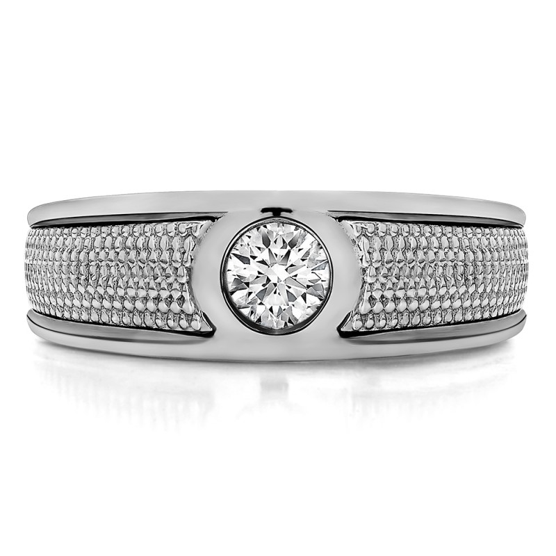 This men's ring features 1 white round bezel set stones. The band measures 5.5mm in total width. The total combined carat weight is 0.38 carats. This listing features moissanite, cubic zirconia or natural diamonds. This men's ring weighs 15.3 grams and features a comfort fit band. This wide men's ring has a designer shank with high polished edges .