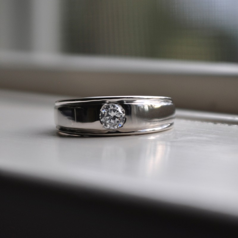 This men's ring features 1 white round burnished set stones. The band measures 5.5mm in total width. The total combined carat weight is 0.5 carats. This listing features moissanite, cubic zirconia or natural diamonds. This men's ring weighs 12.16 grams and features a comfort fit band. This men's solitaire ring features a ribbed edge on the shank and a high polish finish.