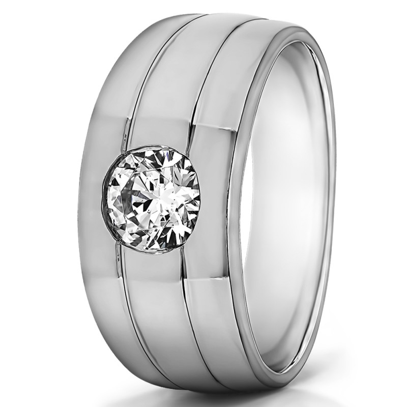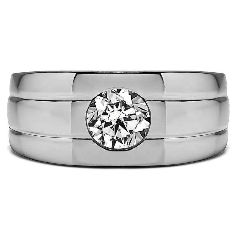 This men's ring features 19 white round burnished set stones. The band measures 5.5mm in total width. The total combined carat weight is 0.74 carats. This listing features moissanite, cubic zirconia or natural diamonds. This men's ring weighs 34.44 grams and features a comfort fit band. This men's ring features a ribbed shank, with a high polish finish.