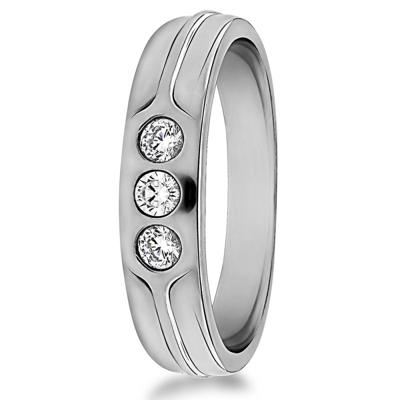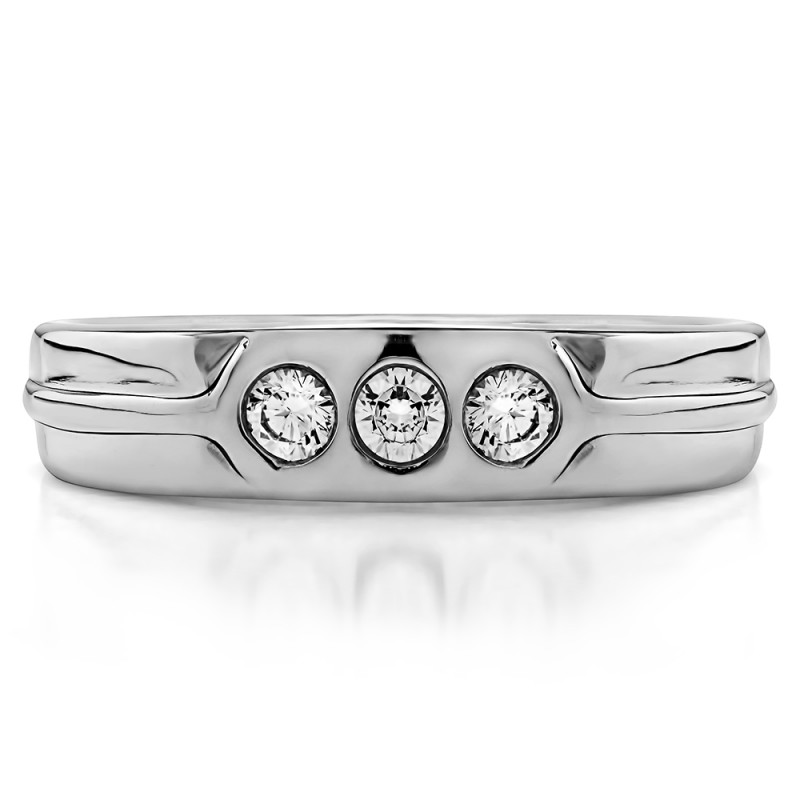 This men's ring features 3 white round burnished set stones. The band measures 5.5mm in total width. The total combined carat weight is 0.33 carats. This listing features moissanite, cubic zirconia or natural diamonds. This men's ring weighs 12.23 grams and features a comfort fit band. This men's ring has a raised center design and a high polish finish.