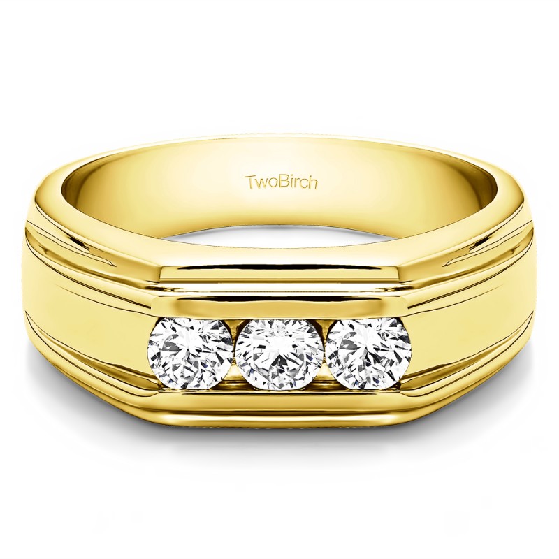 This men's ring features 3 white round channel set stones. The band measures 5.5mm in total width. The total combined carat weight is 0.33 carats. This listing features moissanite, cubic zirconia or natural diamonds. This men's ring weighs 14.61 grams and features a comfort fit band. This men's ring features an open ended channel, with raised edges and a high polish finish.