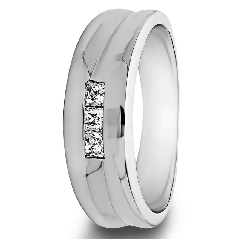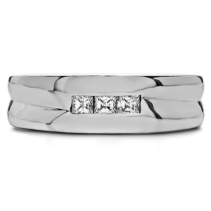 This men's ring features 3 white princess channel set stones. The band measures 5.5mm in total width. The total combined carat weight is 0.33 carats. This listing features moissanite, cubic zirconia or natural diamonds. This men's ring weighs 11.26 grams and features a comfort fit band. This ring has an indented center design with a high polish finish.