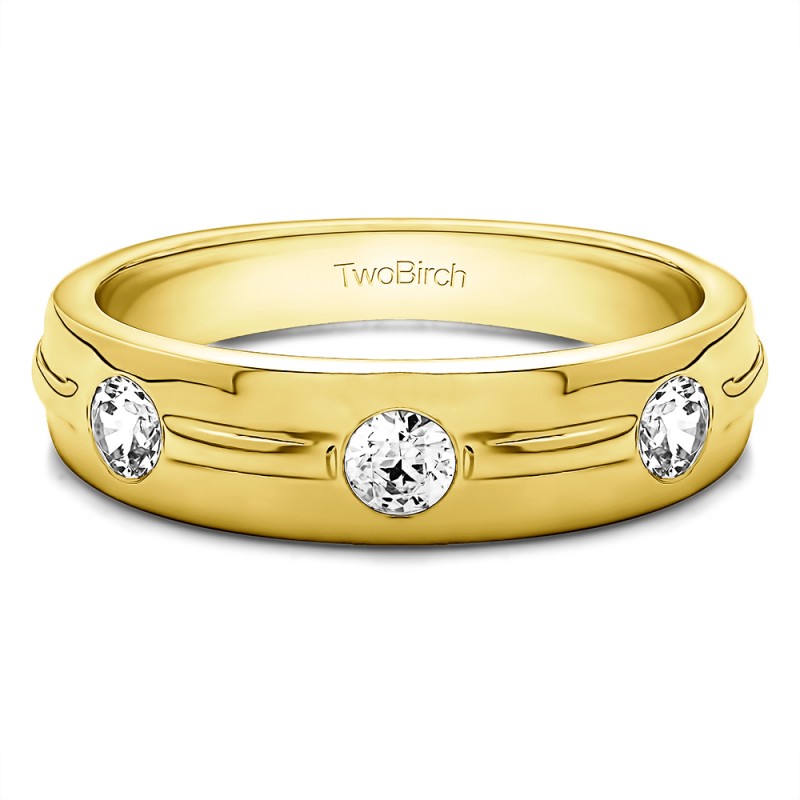 This men's ring features 3 white round burnished set stones. The band measures 5.5mm in total width. The total combined carat weight is 0.35 carats. This listing features moissanite, cubic zirconia or natural diamonds. This men's ring weighs 11.26 grams and features a comfort fit band. This men's band features a raised center between the stones with a polished finish.