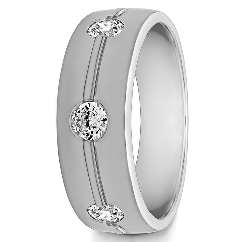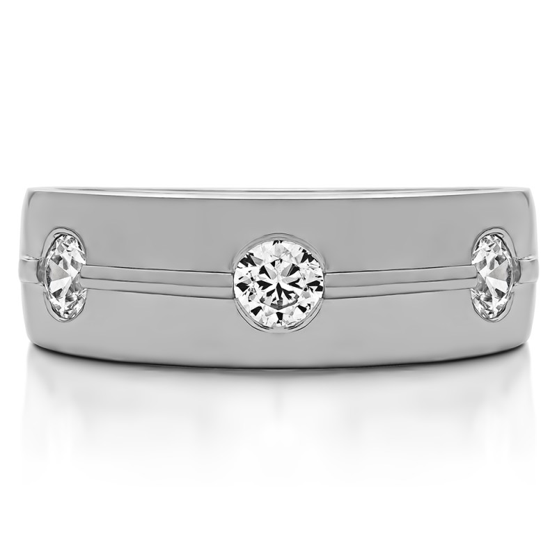 This men's ring features 3 white round burnished set stones. The band measures 5.5mm in total width. The total combined carat weight is 0.5 carats. This listing features moissanite, cubic zirconia or natural diamonds. This men's ring weighs 14.68 grams and features a comfort fit band. This men's ring has a low cut out line in the center between the stones and features a polished finish.