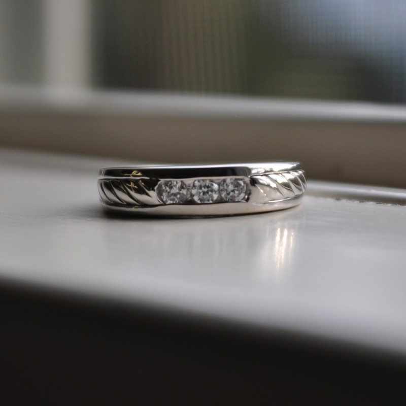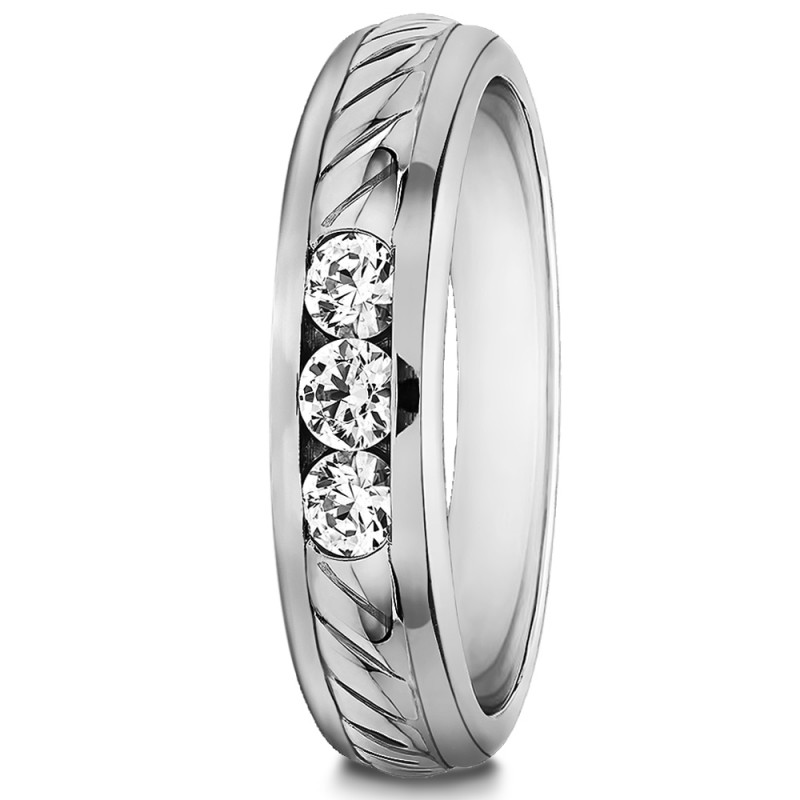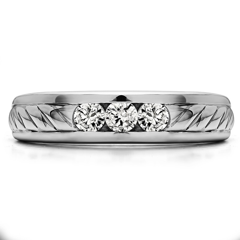 This men's ring features 3 white round channel set stones. The band measures 5.5mm in total width. The total combined carat weight is 0.5 carats. This listing features moissanite, cubic zirconia or natural diamonds. This men's ring weighs 12.75 grams and features a comfort fit band. This ring features a ribbed design center, and high polish edges.