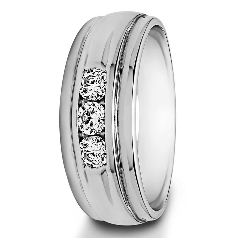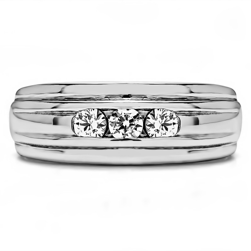 This men's ring features 3 white round channel set stones. The band measures 5.5mm in total width. The total combined carat weight is 0.5 carats. This listing features moissanite, cubic zirconia or natural diamonds. This men's ring weighs 14.5 grams and features a comfort fit band. This men's ring has a high polish finish with a raised center design.