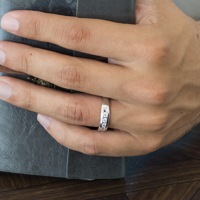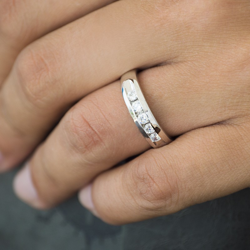 This men's ring features 5 white round channel set stones. The band measures 5.5mm in total width. The total combined carat weight is 0.75 carats. This listing features moissanite, cubic zirconia or natural diamonds. This men's ring weighs 11.16 grams and features a comfort fit band. This men's band features a wide channel, with open ends, and gorgeous high polish finish.