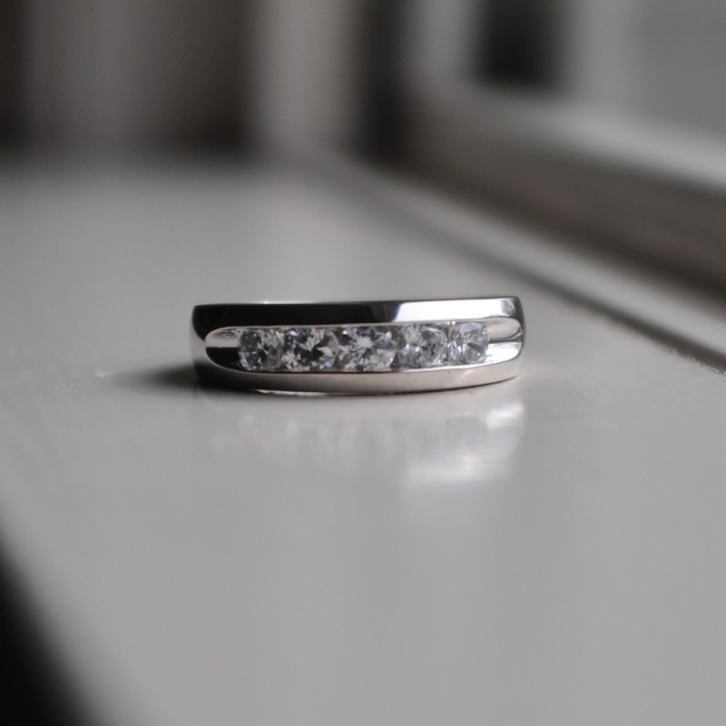 This men's ring features 5 white round channel set stones. The band measures 5.5mm in total width. The total combined carat weight is 1 carats. This listing features moissanite, cubic zirconia or natural diamonds. This men's ring weighs 12.23 grams and features a comfort fit band. This men's band features a wide channel, with open ends, and gorgeous high polish finish.