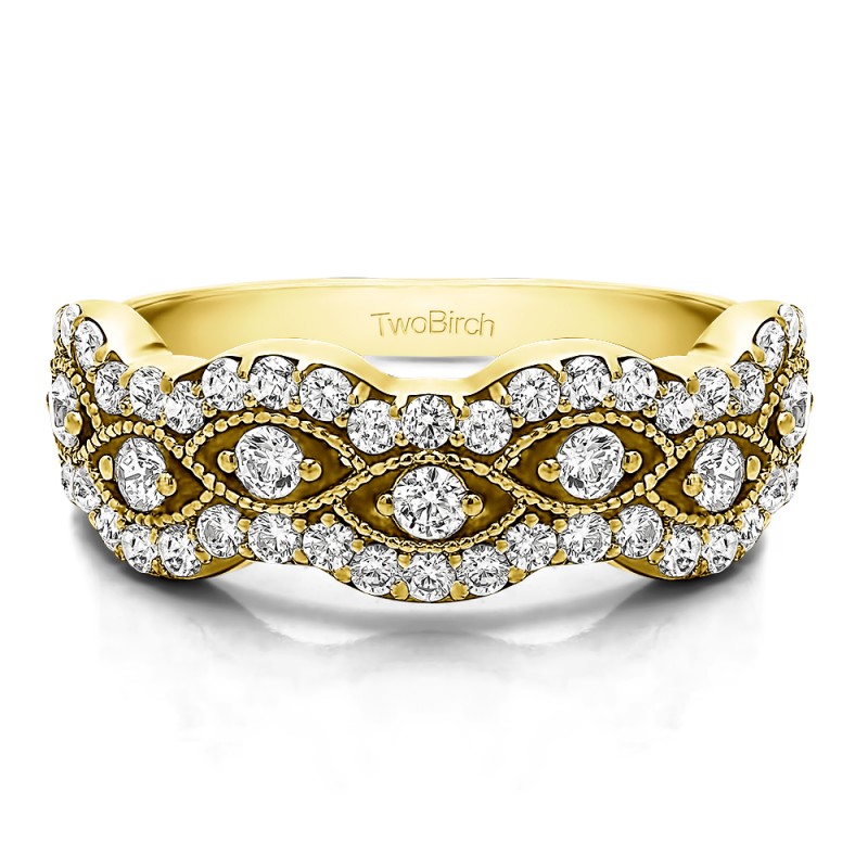 Confirm your everlasting love with this spectacular swirl style promise band. It features two outer rows of contoured sections of round accent stones. In the center of those accent stones you will find milgrain detailed metal with a stone in each section. It is the perfect combination of vintage and modern. Nothing will make a bigger statement than this beautiful promise band. You will be amazed at the high quality of the Diamonds G-H I2-I3 set in the beautiful 10k Yellow gold. 10k Yellow gold Promise Rings by TwoBirch are built to last a lifetime.