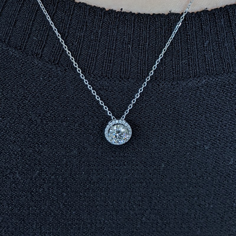 | Key Product Features | The pendant features one 6.5 mm round moissanite which is a 1 carat diamond equivalent weight. The pendant is set in a 6 prong setting and sits on a 925 sterling silver platinum plated cable chain which is made in Italy. The chain is 18 inches long |