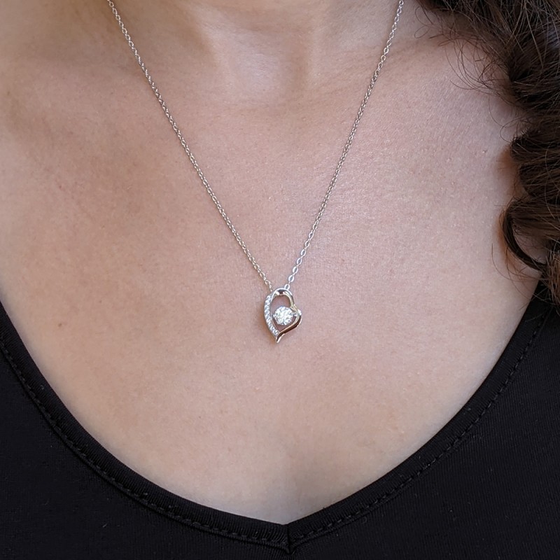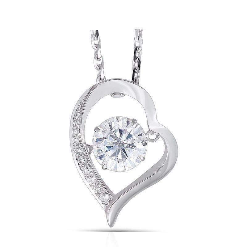 This pendant features one 6.5 mm round moissanite which is a 1 carat diamond equivalent weight. The pendant is set in a 6 prong setting and dangles and floats in the center of the heart. The heart shaped pendant features moissanite accents and it sits on a 925 sterling silver platinum plated cable chain which is made in Italy measuring 18" in length.