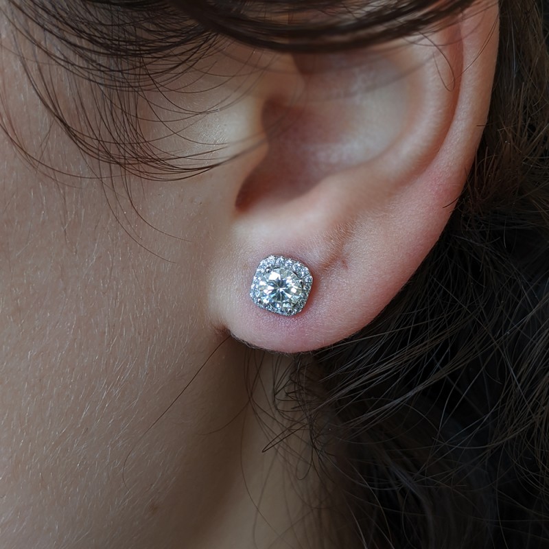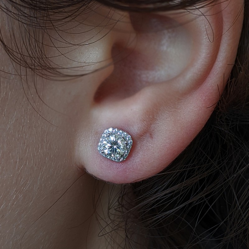 | Key Product Features | Stunning platinum plated square halo stud earrings featuring two round brilliant cut moissanite stones measuring 5 mm each. |