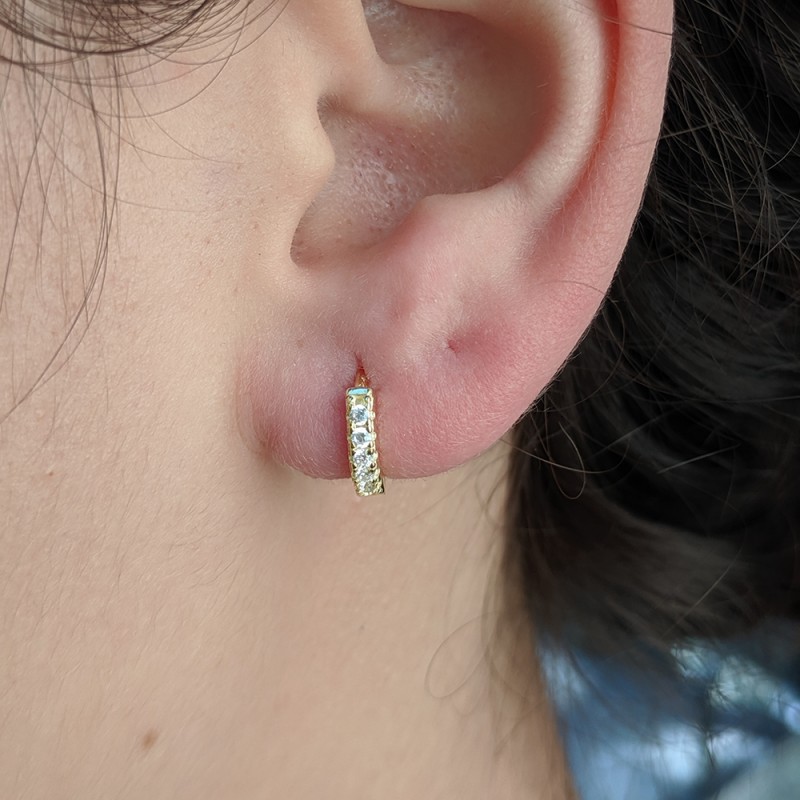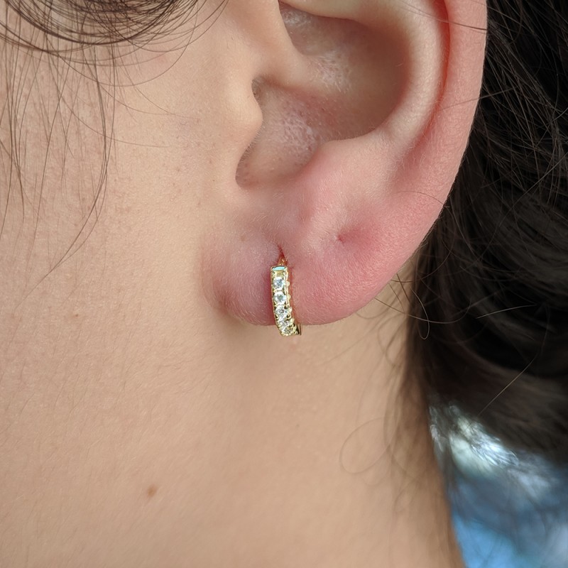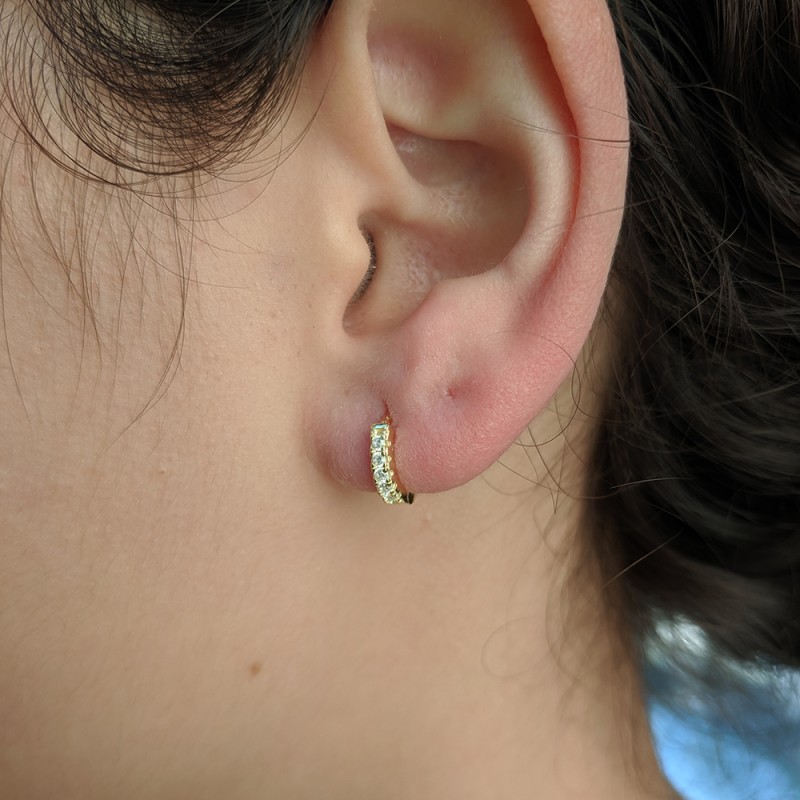 These adorable mini Small Hoops are cute and perfect for every day wear. They feature a single row of AAA+ quality cubic zirconia set in solid sterling silver with 14k yellow gold plating to avoid tarnish.
