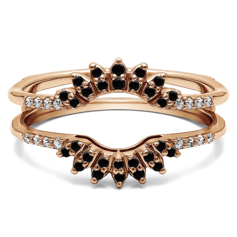 This wedding ring guard has 44 round, prong set stones. Each band measures 2 millimeters wide. This ring guard has 0.2 carats total weight.