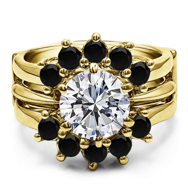 This wedding ring guard has 10 round, prong set stones. Each band measures 2.5 millimeters wide. This ring guard has 0.2 carats total weight. It is made to fit a round solitaire from 0.25 carats to 2, or a princess cut solitaire from 0.5 up to 2 carats.