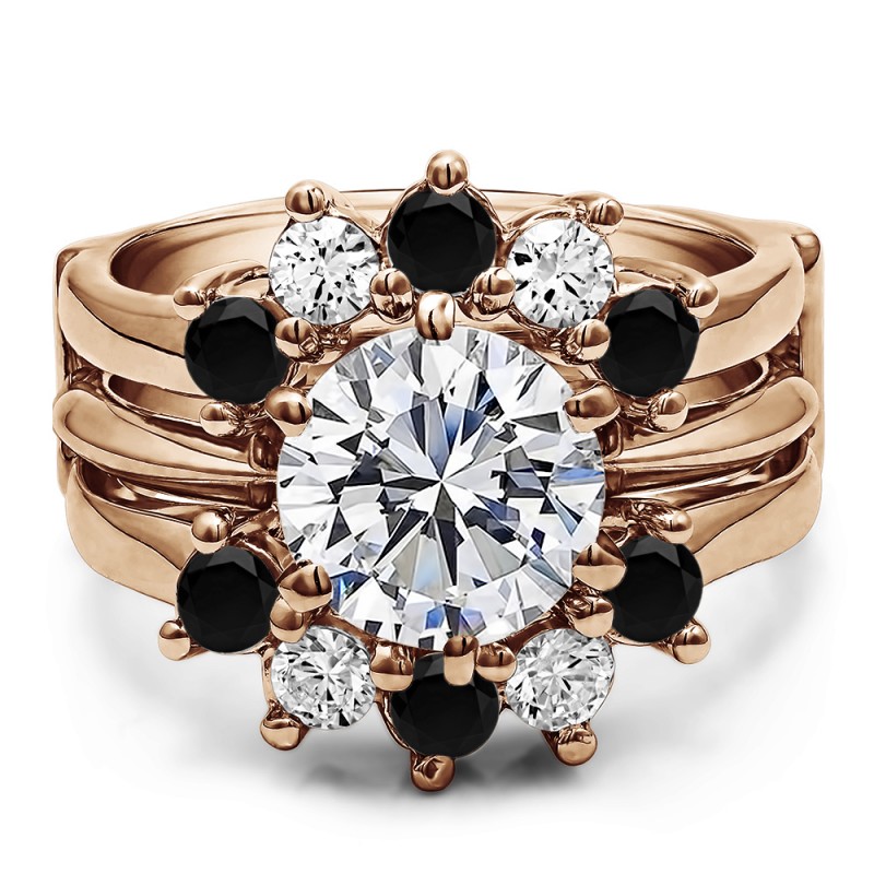 This wedding ring guard has 10 round, prong set stones. Each band measures 2.5 millimeters wide. This ring guard has 0.2 carats total weight. It is made to fit a round solitaire from 0.25 carats to 2, or a princess cut solitaire from 0.5 up to 2 carats.