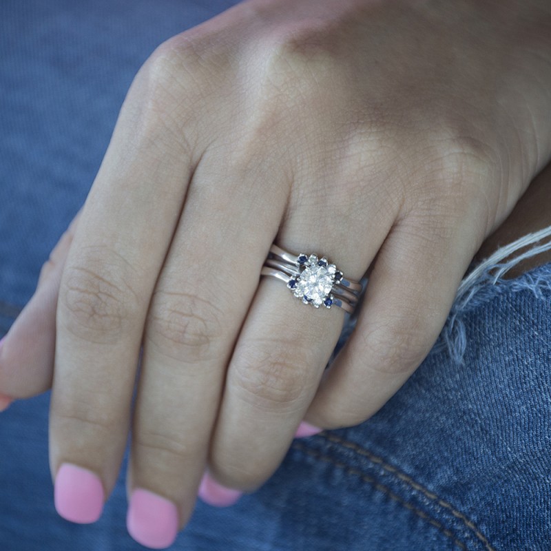 This wedding ring guard has 10 round, prong set stones. Each band measures 2.5 millimeters wide. This ring guard has 0.2 carats total weight. It is made to fit a round solitaire from 0.25 carats to 2, or a princess cut solitaire from 0.5 up to 2 carats.