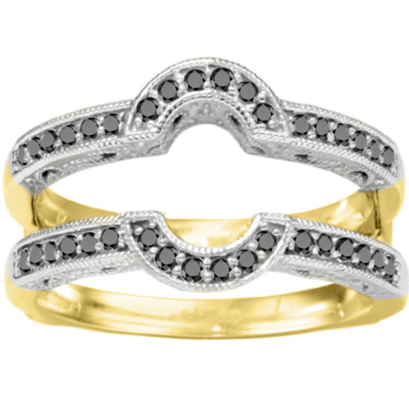 This wedding ring guard has 36 round, channel set stones. Each band measures 2 millimeters wide. This ring guard has 0.21 carats total weight. It is made to fit a round solitaire from 0.5 carats to 1 carats.
