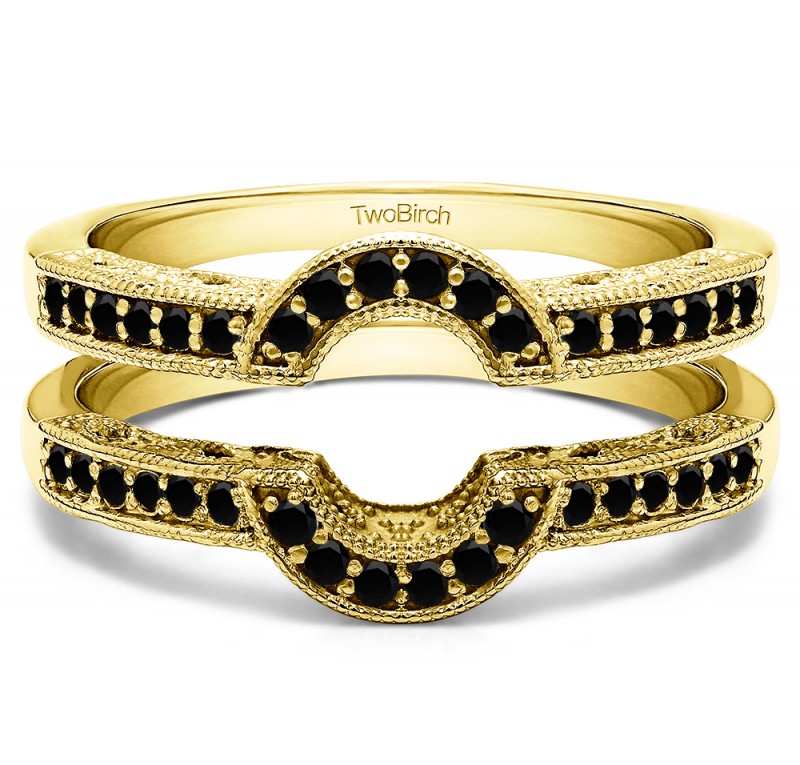 This wedding ring guard has 36 round, channel set stones. Each band measures 2 millimeters wide. This ring guard has 0.21 carats total weight. It is made to fit a round solitaire from 0.5 carats to 1 carats.