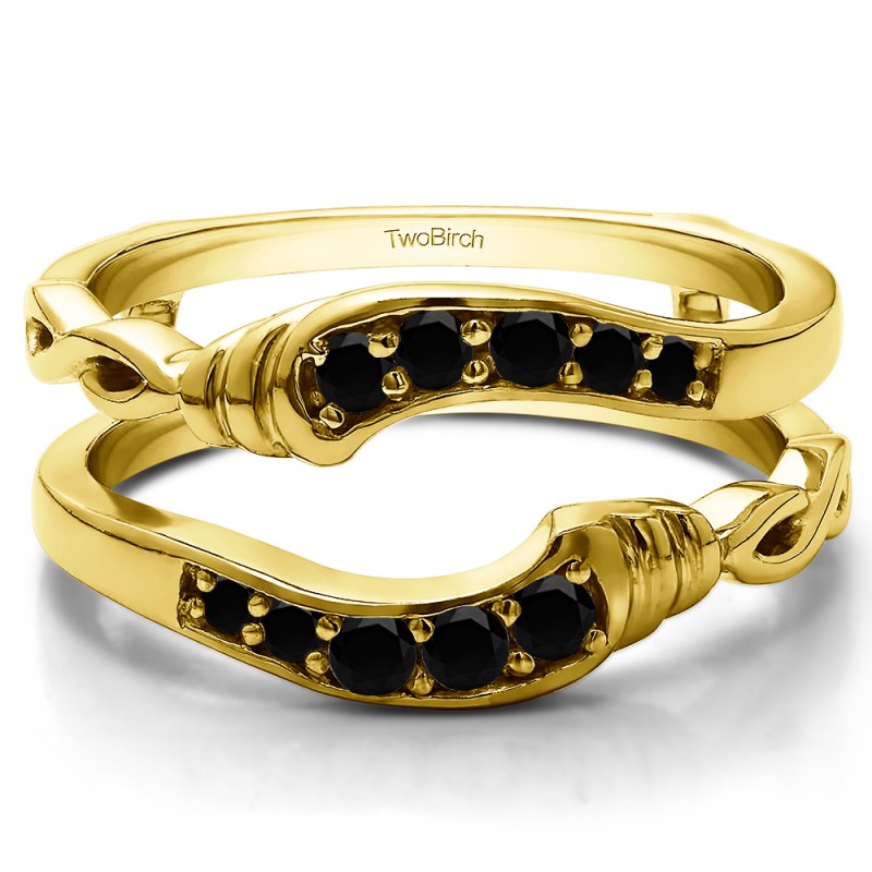 This wedding ring guard has 10 round, prong set stones. Each band measures 2.34 millimeters wide. This ring guard has 0.22 carats total weight. It is made to fit a round solitaire from 0.5 carats to 1, or a princess cut solitaire from 0.5 up to 2, or a marquise solitaire from 0.5 up to 1.5 carats.