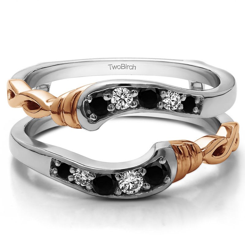 This wedding ring guard has 10 round, prong set stones. Each band measures 2.34 millimeters wide. This ring guard has 0.22 carats total weight. It is made to fit a round solitaire from 0.5 carats to 1, or a princess cut solitaire from 0.5 up to 2, or a marquise solitaire from 0.5 up to 1.5 carats.